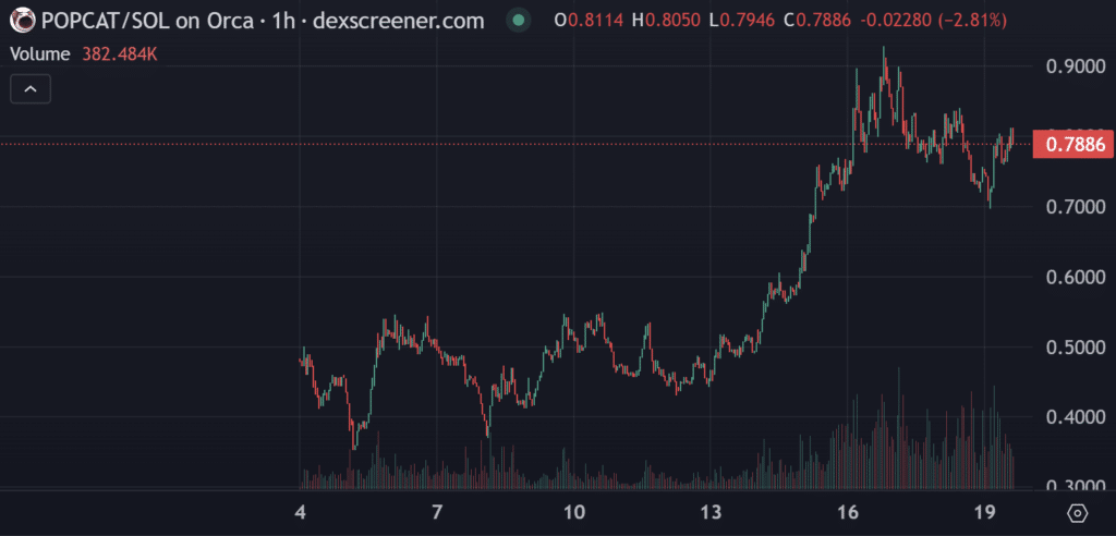 Wykres kryptowaluty POPCAT, źródło: Dexscreener3. Kryptowaluty memowe