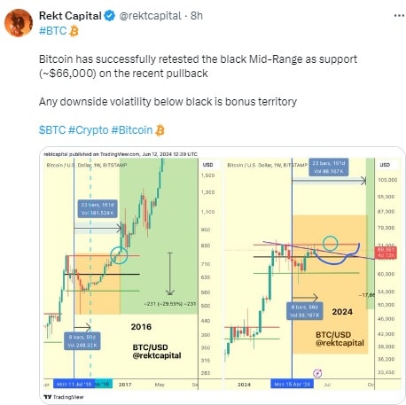 Źródło: https://twitter.com/rektcapital/status/1800872664812446015Rekt Capital ocenił, iż Bitcoin z powodzeniem potwierdził granicę 66 000 dolarów jako nowe wsparcie na wykresie tygodniowym. Analityk napisał w poście X z 12 czerwca: „Bitcoin ponownie pomyślnie przetestował czarny średni zakres jako wsparcie (~66 000 USD) w związku z niedawnym wycofaniem”.