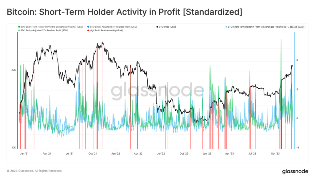 Glassnode umieścił oba wskaźniki na jednym wykresie. Stworzył narzędzie, które pomoże zidentyfikować krótkoterminowe warunki przegrzania / wyprzedania. W oparciu o zachowanie wydatków grupy STH. Ostatniemu wzrostowi do 44,2 tys. USD towarzyszył statystycznie znaczący stopień realizacji zysków przez STH. Wraz z premią NVT i rozszerzonym wskaźnikiem zrealizowanego zysku/straty Glassnode podkreśla zbieg czynników sugerujących potencjalne wyczerpanie popytu.