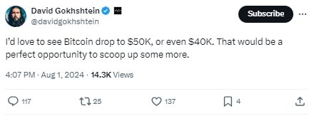 Źródło: https://x.com/davidgokhshtein/status/1819012162976682417David Gokhstein, założyciel Gokhstein Media, napisał, iż wręcz oczekuje kolejnych spadków. W jednym z ostatnich postów na portalu X Gokhstein napisał: „Chciałbym, aby Bitcoin spadł do 50 tys. dolarów, a choćby 40 tys. dolarów. Byłaby to doskonała okazja, aby zdobyć więcej”.