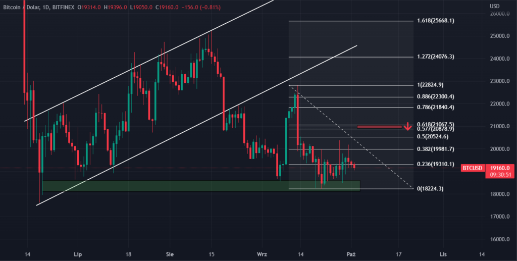 Zauważalny jest słabnący popyt i coraz większa powracająca presja sprzedających. Na wykresie widać większą kontynuację spadków rozpoczętą w dniu 13 września. Podczas mierzenia tego całego ruchu spadkowego można zauwazyć, iż maksymalnym podejściem wzrostowym na ten moment jest wartość okolic 21000$ – skąd prognozuje się dalszą wyprzedaż.