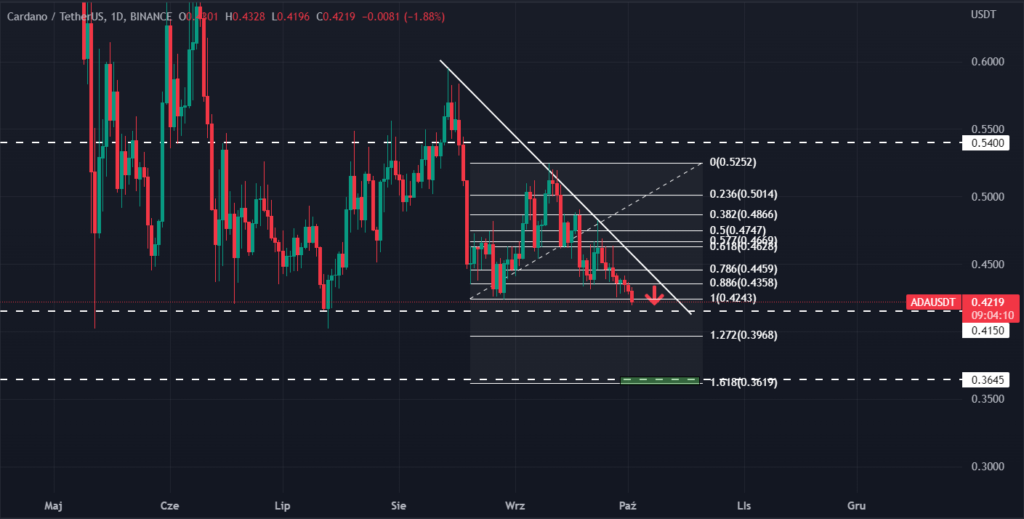Na dziennym wykresie Cardano (ADA) także nie widać optymizmu. Cena utrzymuje sentyment spadkowy. W teorii ADA ma szanse wybronić po raz kolejny poziom 0,4150$ i odbić się w krótkim terminie wzrostowo, jednak należy pamiętać, iż każdy kolejny test poziomu wsparcia może być już przebity dołem. jeżeli obecne wsparcie nie wytrzyma kolejnego testu, należy spodziewać się wyprzedaży w stronę 0,3645$. Jest to mierzenie Fibonacciego 1.618 oraz strefa popytowa z początku 2021 roku.