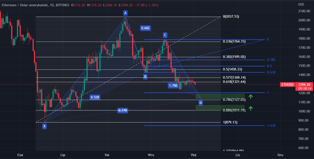 Na notowaniach Ethereum (ETH) cały czas wyczekiwane jest wypełnienie poniższego układu harmonicznego, który sugeruje zejście w rejony mierzenia Fibonacciego 0.786 lub 0.886, gdzie powinna pojawić się reakcja wzrostowa.