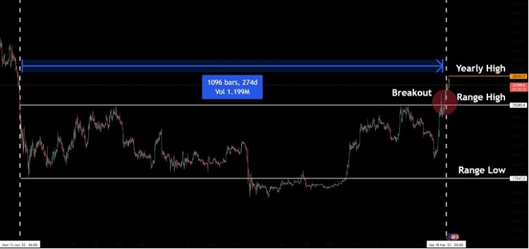 „Należy jednak zauważyć, iż wejście nowych uczestników rynku i kupowanie spot są zwykle związane z wczesnymi etapami rynku byka lub późniejszymi etapami rynku niedźwiedzia. Dlatego rozsądnie jest poczekać na potwierdzenie, iż wybicie z 273-dniowego przedziału zostanie utrzymane, zanim zaangażujemy się w rynkowe zakupy BTC.”