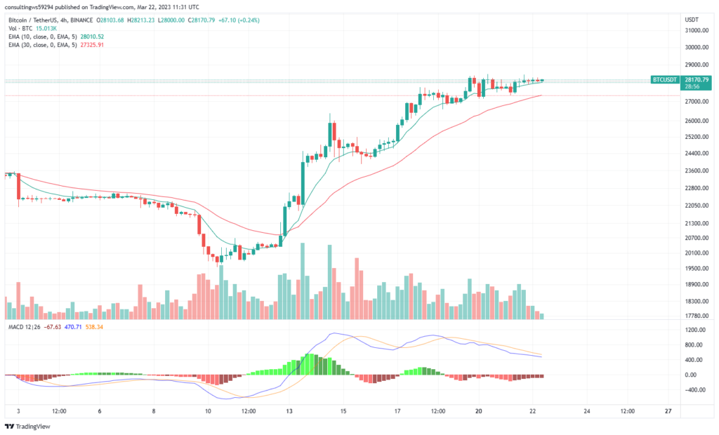 Dane dostarczone przez TradingView pokazują, iż byki na Bitcoinie przez cały czas broniły wsparcia na poziomie 28 000 USD i w pewnym momencie próbowały podnieść jego cenę, ale napotkały silny opór na poziomie 28 600 USD, co spowodowało spadek ceny do 28 200 USD.
