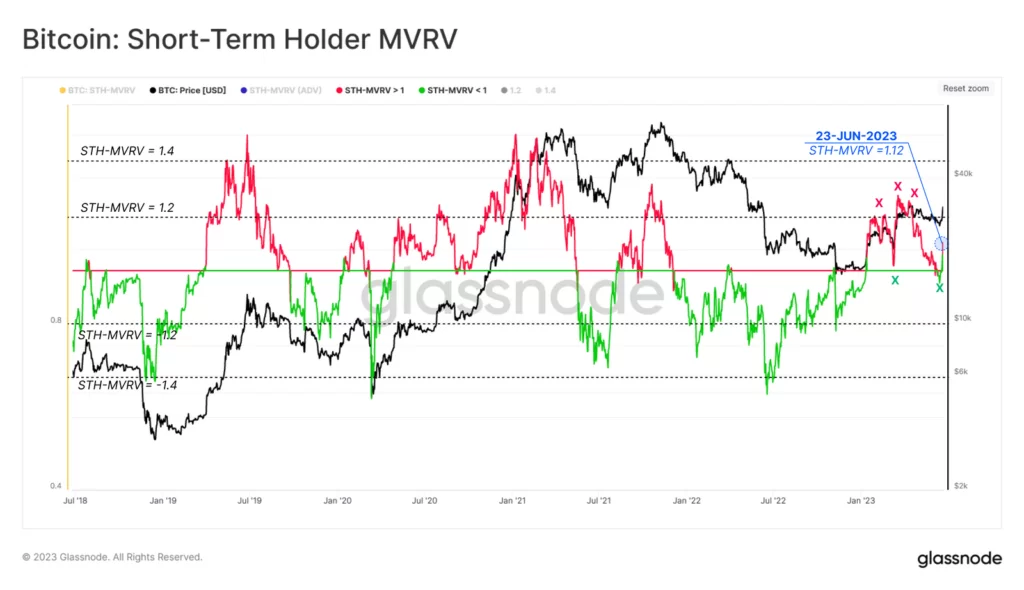 Wskaźnik MVRV dla krótkoterminowych inwestorów odbił ponownie od neutralnego poziomu rentowności (1,0. w tej chwili wynosi 1,12, co wskazuje, iż grupa posiadaczy krótkoterminowych posiada w tej chwili średnio 12%. Ryzyko korekty wzrasta, gdy wskaźnik przekracza poziomy od 1,2 (około 33 tys. USD) do 1,4 (około 39 tys. USD). Wówczas inwestorzy notują coraz większe niezrealizowane zyski.