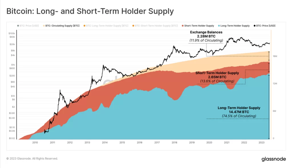 Oszacowanie przepływów kapitałowych może być mierzone poprzez zmianę wielkości wysoce aktywnego poziomu podaży w obiegu. Gdy nowy popyt wchodzi na rynek. inwestorzy zwykle reagują poprzez zawieranie transakcji i dystrybucję BTC po wyższych cenach. Wydawanie 'starych’ BTC nieodłącznie wiąże się z ekspansją nowych byków – 'młodych’ BTC. w tej chwili długoterminowi inwestorzy posiadają prawie 75% podaży Bitcoina. Przy 13,6% udziałach krótkoterminowych spekulantów.