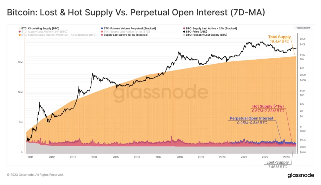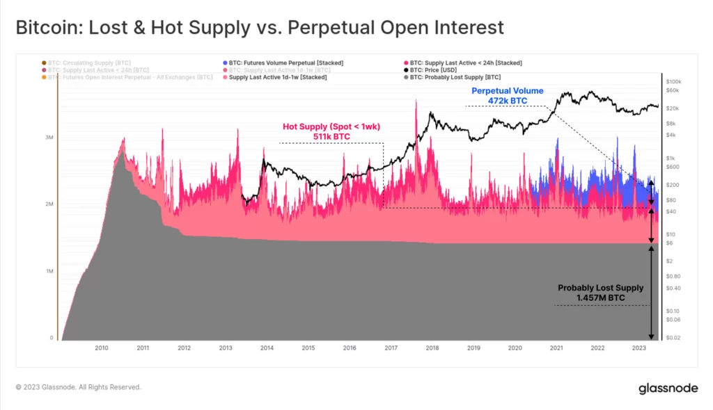 Źródło: GlassnodePrzy medianie 0,67 mln BTC i rekordzie 2,2 mln BTC, gorąca podaż stanowi od 3,5% do 11,3% całkowitej podaży. To liczba porównywalna z ilością prawdopodobnie utraconych monet (1,46 mln BTC to ok. 7%). Nie zmieniły one nabywcy od początku handlu BTC, w lipcu 2010 roku. Na kontraktach pochodnych Futures Open Interest (472 tys. BTC) i gorąca podaż (511 tys. BTC) są także podobnej wielkości. To wskazuje, iż wolumen około 983 tys. BTC (ok. 20 mld USD D) jest w tej chwili możliwy do upłynnienia. Z tego prawie połowę stanowi rynek spot BTC.