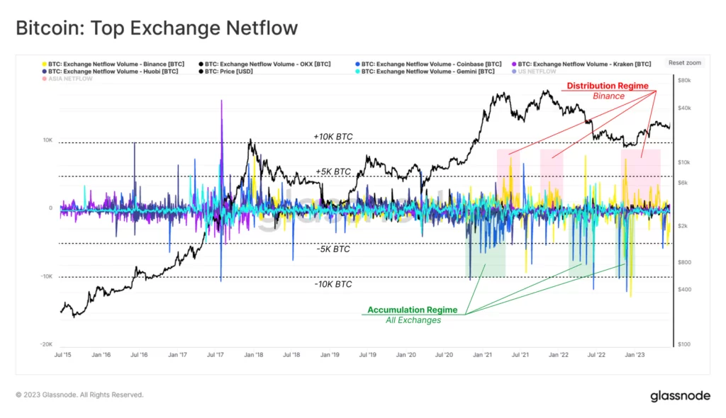 Źródło: GlassnodeGlassnode zidentyfikował ramy regionalnych przepływów BTC. Wyodrębił trzy największe giełdy z regionów USA i Azji wg. CoinGecko.