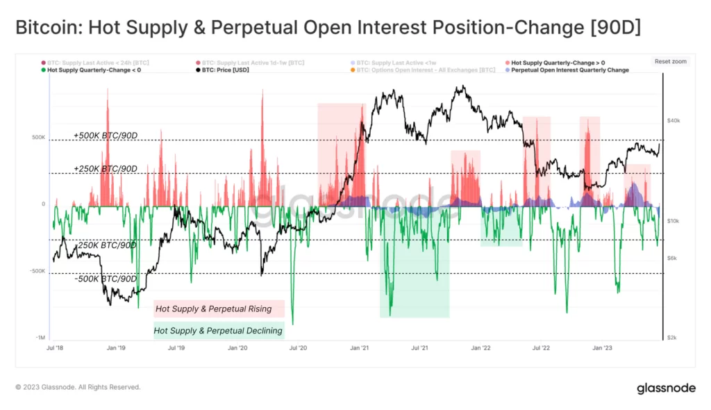 Źródło: GlassnodeGlassnode zidentyfikował powiązania między ceną a zmianami w tzw. Hot Supply i Perpetual Open Interest. Wykres pokazuje 90-dniową zmianę pozycji gdy on-chain zidentyfikowany zostął kierunek i wielkość przepływu kapitału gorącej podaży (czerwony) do kontraktów pochodnych (zielony). Podczas poprzednich rajdów i kapitulacji, na rynek trafiało od 250 do 500 tys. BTC. W czasie przedłużających się spadków, podobna wielkość wolumenu akumulowanajest i dosłownie znika z rynku.