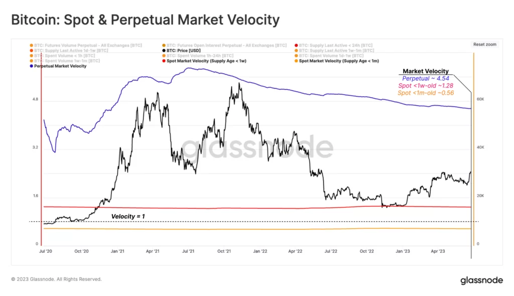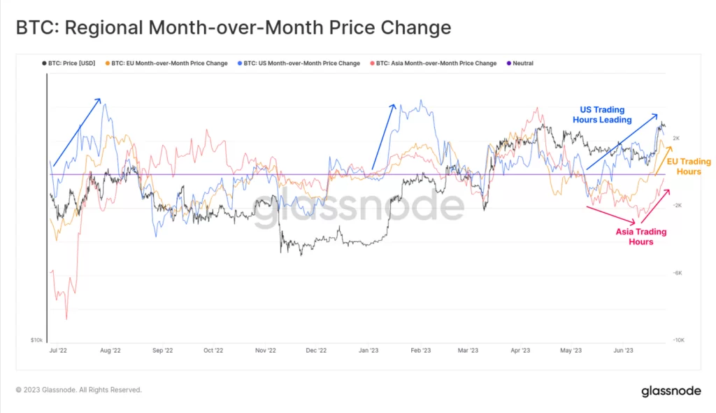 Glassnode wskazuje, iż migracja funduszy głównych uczestników rynku BTC, czyli inwestorów z USA i Azji pokazuje silną akumulację w czasie azjatyckiej sesji. Sesje na rynku w USA konsekwentnie wykazały słabszy popyt w 2023 roku. Dane on chain wskazują, ze krótkoterminowi inwestorzy w 2023 dokonali istotnej zmiany psychologicznej. Niedawno cena znów wzrosła powyżej średniej ceny po której akumulowali Bitcoina, ograniczając podaż. Oczekiwania wzrosną w miarę jedzenia? Powinno to sprzyjać zwyżkom ceny.
