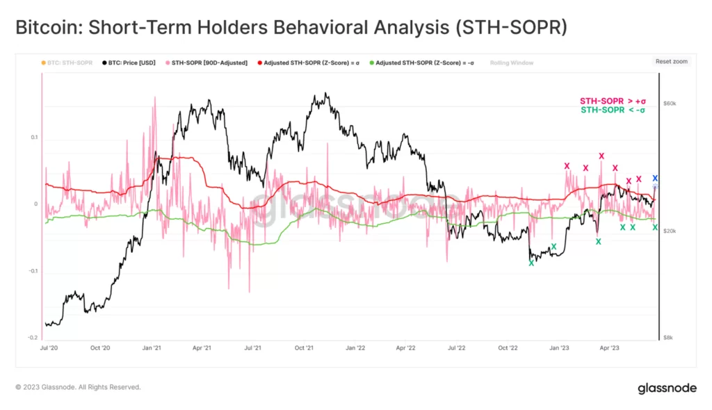 Źródło: GlassnodeGlassnode przyjrzał się wydatkom inwestorów STH od początku roku. Wykreślił górne jak i dolne pasma używając 90-dniowych miar. Oraz odchylenia standardowego jako dodatkowego narzędzia do oceny prawdopodobnych punktów kluczowych dla ceny. Wielokrotnie w ostatnich tygodniach następowało wyczerpanie sprzedających spot (poniżej zielonej linii). Ostateczne minimum zostało wybite na poziomie 25,1 tys USD, przed odbiciem powyżej 30 tys. dolarów.