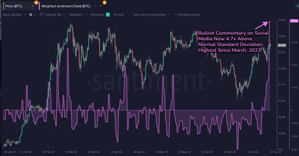 Ważony indeks nastrojów Santiment – wskaźnik, który mierzy wzmianki o Bitcoinie na X i porównuje stosunek komentarzy pozytywnych do negatywnych – jest na „16-miesięcznym wysokim pozytywnym sentymencie”.
