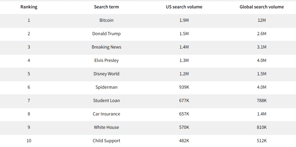Jak pokazano powyżej, inne popularne terminy w kolejce po Bitcoinie i Donaldzie Trumpie to: