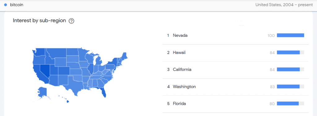 Porównanie liczby wyszukiwań oparte na danych Ahrefs ujawnia, iż Amerykanie najbardziej są ciekawi Bitcoina. A stan Nevada zajmuje I miejsce jako „stan najbardziej zwariowany na punkcie Bitcoina” w Stanach Zjednoczonych. Pomimo tego, iż były prezydent USA Donald Trump regularnie pojawia się na pierwszych stronach gazet, zajmuje dopiero drugie miejsce na liście najczęściej wyszukiwanych haseł w Ameryce.