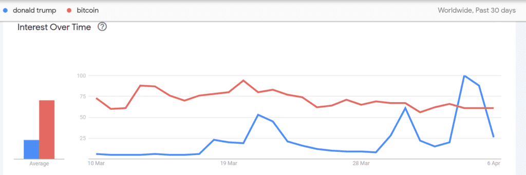 Według danych Google Trends, w ciągu ostatnich 30 dni liczba wyszukiwań Donalda Trumpa w Google pobiła zainteresowanie Bitcoinem. Miało to miejsce 4 i 5 kwietnia, kiedy pojawiły się doniesienia o możliwym aresztowaniu byłego prezydenta.