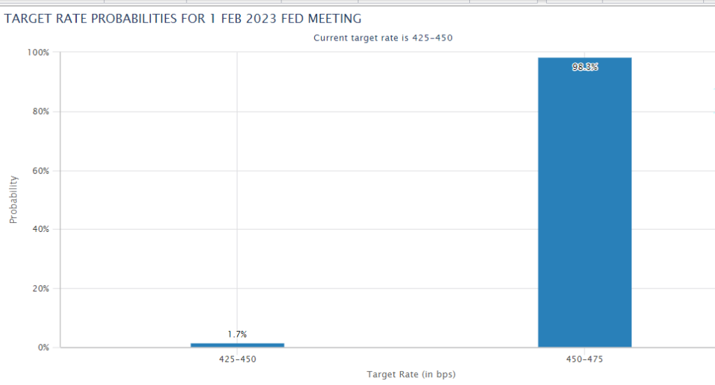 Tak, już 1 lutego przekonamy się czy Rezerwa Federalna podniesie stopy procentowe o 25 pb czy 50 pb. Brak decyzji o podwyżce jest w tej chwili ekstremalnie mało prawdopodobny dlatego nie weźmiemy go choćby pod uwagę w dzisiejszych rozważaniach.
