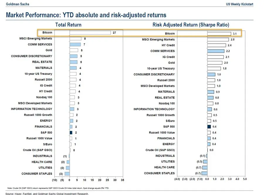 Zgodnie z raportem zwrotu aktywów w ujęciu rocznym przez Goldman Sachs, Bitcoin jest ich najlepiej radzącym sobie aktywem w 2023 roku. Pokazuje to olbrzymi wzrost sentymentu do ryzyka. Co bardzo ważne, kryptowaluty znów pokazały, iż są jego pierwszorzędnym beneficjentem, a spekulacja na rynku cyfrowych aktywów pozostaje 'żywa’ mimo konsolidacji. Teraz Bitcoin to aktywo numer jeden przewyższające największe, najbardziej znane aktywa z sektora finansowego. Bitcoin przebił Nasdaq 100, S&P 500, złoto i nieruchomości. Co więcej zdeklasował również rynki wschodzące – hit ostatnich tygodni. Jak długo stan ten się utrzyma?
