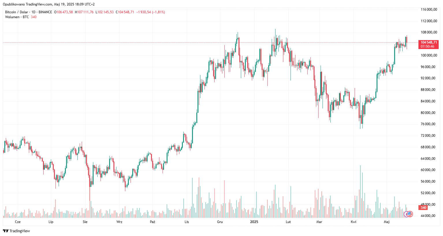 W ostatnich dniach bitcoin wzbudził ogromne zainteresowanie inwestorów, osiągając lokalne maksimum na poziomie 106 000 USD – najwyższy poziom cenowyj od lutego 2025 roku. Choć obecna cena na 19 maja wynosi około 104 500 USD, a więc o 0,5% mniej niż dzień wcześniej, to fundamenty rynkowe wyraźnie się poprawiają.