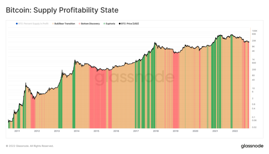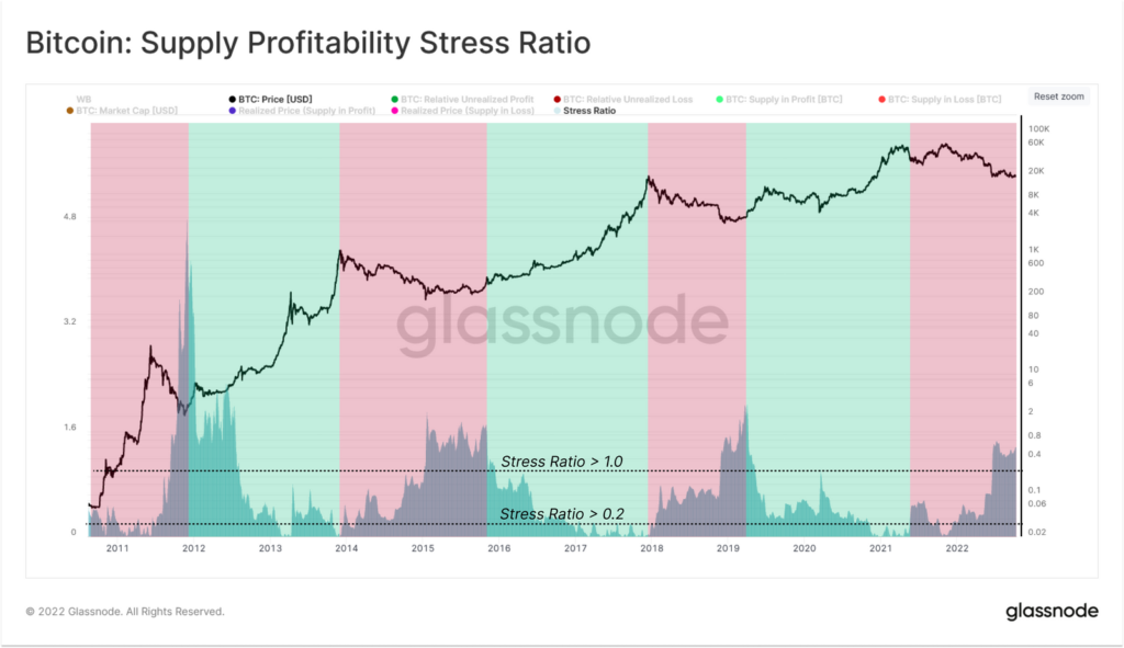 Biorąc pod uwagę poprzednie cykle Bitcoina, w każdym możemy zaznaczyć trzy fazy. Fazę odkrywania dna (czerwony), fazę euforii (zielony) oraz fazę neutralną (pomarańczowy). W fazie odkrywania dna okres spadającej ceny przedłuża sie i sprawia, iż udział podaży w stracie staję się dominujący (powyżej 55%). Podczas hossy z kolei procent tokenów w zysku przewyższa 95%. W okresach neutralnych rentowność utrzymuje sięmiędzy tymi dwiema fazami. w tej chwili widzimy, iż ilość podaży w stracie zaznaczona jest na czerowno co może stanowić korzystny sygnał przede wszystkim dla długoterminowych inwestorów chcących akumulować Bitcoina. Źródło: Glassnode