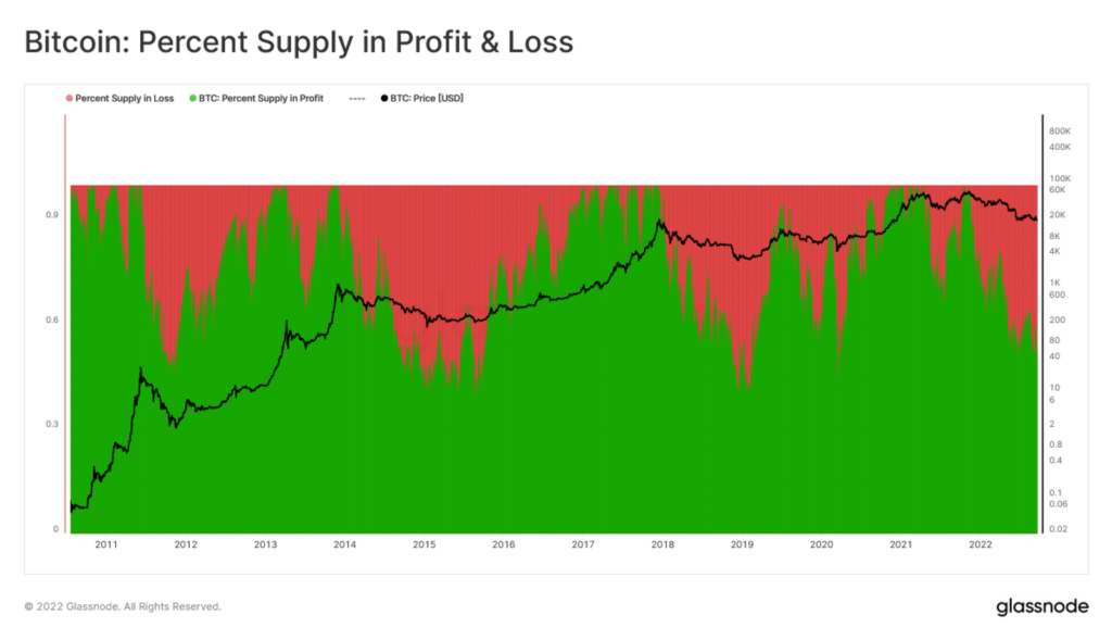 We wszystkich cyklach Bitcoina krążaca podaż tokenów oscyluje oczywiście między podażą BTC w stracie (kolor czerwony), a podażą BTC w zysku (kolor zielony). Patrząc na wykres widzimy, iż ilość BTC w stracie zbliża się do poziomów, które historycznie wskazywały na potencjalnie okazyjne wyceny w kontekście kolejnego cyklu hossy. Źródło: Glassnode