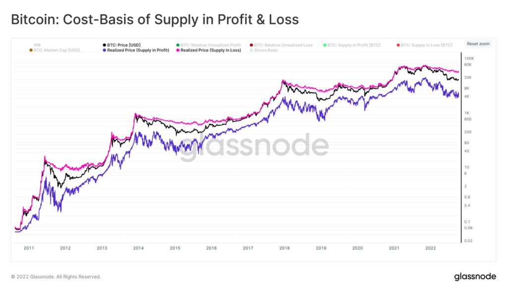 Dzięki udziałowi Bitcoinów w stracie i zysku w całkowitej dostępnej podaży obiegowej, podstawę kosztową tych działów można obliczyć dzięki wzoru. Historyczne, wynikowe podstawy kosztowe dla inwestorów w stracie (kolor fioletowy) i w zysku (kolor niebieski) są zilustrowane obok ceny spotowej na wykresie. Średnia cena nabycia BTC dla podaży w zysku (niebieski) wynosi ok 5 tys USD. Średnia cena Bitcoinów należących do podaży w stracie wskazuje na poziomy bliskie 35 000 USD. Oba te poziomy mogą potencjalnie okazać się najważniejsze dla przyszłej reakcji cenowej, a rynek poruszając się przy 20 000 USD de facto był w fazie równowagi między dwiema tymi grupami. Weźmy jednak pod uwagę, iż wraz ze spadkiem ceny Bitcoina zrealizowana cena podaży BTC spada. Źródło: Glassnode