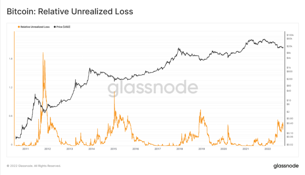 Baza kosztowa określonej grupy inwestorów rynkowych jest równa zagregowanej niezrealizowanej wartości denominowanej w USD, podzielonej przez ilość monet posiadanych przez daną grupę (LTH i STH). Wykres przedstawia względny niezrealizowany zysk lub całkowity zysk wyrażony w USD wszystkich istniejących Bitcoinów, których cena w momencie realizacji była niższa niż obecna cena znormalizowana przez kapitalizację rynkową. Ten wskaźnik również wskazuje na korzystne dla długoterminowych inwestorów poziomy. Jednocześnie to wciąż krótkoterminowi traderzy w obecnej fazie najbardziej wpływają na ceny Bitcoina (przeciwna sytuacja ma miejsce w hossie, gdy podaż LTH ma potężny wpływ na rynek). Pokusa traderów może wskazywać na sprowadzenie Bitcoina na jeszcze niższe, potencjalnie atrakcyjne poziomy kupna. Patrząc na poprzednie cykle, widzimy iż wykres niezrealizowanych zysków (żółty) miał tendencję by wybijać dołki na jeszcze niższych poziomach. Źródło: Glassnode