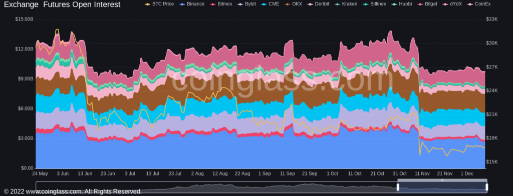 Dane z Coinglass dodatkowo pokazały, iż otwarte zainteresowanie kontraktami futures przez cały czas spada.