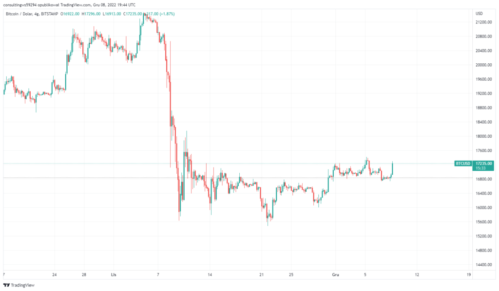 Kurs Bitcoina najpierw spadł z 17 226 USD i cały dzień oscylował poniżej 17 000 USD na otwarciu Wall Street 8 grudnia.