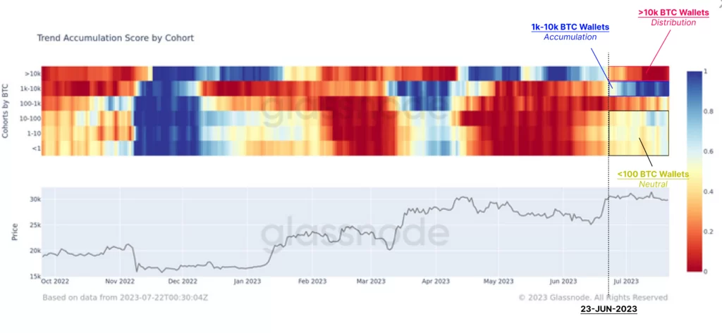 Przedstawiony powyżej, analizowany przez Glassnode’a wynik akumulacji według grup inwestrów, iż najmniejsze podmioty (poniżej 100 BTC) spowolniły sprzedaż w czerwcu. Z drugiej strony, grupa wielorybów posiadająca wykazywała niejednoznaczne zachowania. Adresy posiadające ponad 10 tys. BTC wyraźnie sprzedawały, co dobrze obrazuje dystrybucja na wykresie. W tym samym czasie portfele między 1–10 tys. BTC akumulowały Bitcoina w znacznie szybszym tempie. Podział portfeli, czy dystrybucja z najwyższych poziomów piramidy posiadaczy?