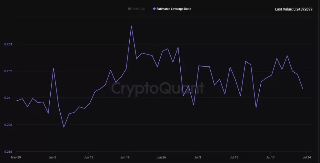 Dźwignia finansowa umożliwia otwieranie pozycji o wartości większej niż depozyt lub inne aktywa zdeponowane jako taki na giełdzie. Korzystanie z niej może zwiększyć zarówno zyski, jak i straty. Co więcej naraża spekulantów na likwidację – automatyczne zamknięcie byczych lub niedźwiedzich pozycji z powodu braku depozytu zabezpieczającego. Im wyższy stopień dźwigni, tym większe prawdopodobieństwo, iż likwidacje wprowadzą zmienność na rynek. Spowodowaną zwykle masowymi 'margin callami’. Jednym ze sposobów śledzenia wykorzystania dźwigni finansowej na rynku crypto jest podzielenie wolumenu 'open interest’ przez wartość BTC w portfelach powiązanych z portfelami giełd instrumentów pochodnych. Tak oszacowana szacowana dźwignia finansowa, spopularyzowana przez CryptoQuant, pozostaje w dużej mierze w stagnacji od 20 czerwca, co jest oznaką, iż przeciętny trader gra bezpiecznie.