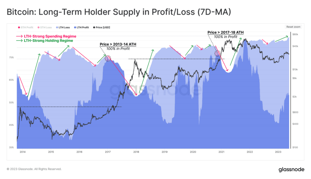 Gdy rynek przełamuje ATH z poprzedniego cyklu, motywacja do zwiększenia wydatków (realizacja zysków) znacznie wzrasta. Skutkuje to dramatycznym spadkiem podaży LTH. Wówczas długoterminowi inwestorzy sprzedają swoje Bitcoiny – zwykle dla krótkoterminowych (lub nowych nabywców), którzy kupują BTC po wysokich cenach. Przez cały okres bessy, pierwsza faza podaży LTH przebiegała dokładnie tak samo. Niezwykła odporność posiadaczy BTC została przetestowana w warunkach ekstremalnej zmienności. HODLerzy zdali egzamin.