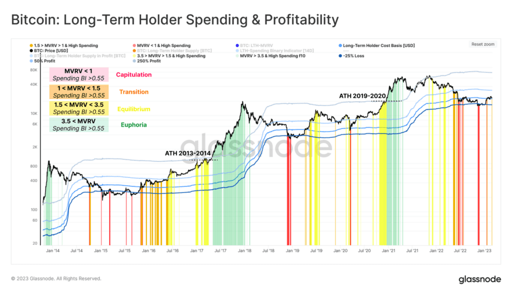 - Euforia (zielony kolor). Gdy LTH-MVRV osiąga poziom 3,5 (historycznie zbieżny z Bitcoinem osiągającym wcześniejsze ATH), długoterminowi inwestorzy utrzymują średnio około. 250% zysku. Rynek wchodzi w fazę euforii, która ostatecznie motywuje tych inwestorów do wydawania i realizacji zysków, w bardzo szybkim tempie (warunki: LTH-MVRV > 3,5 i SBI = 1,00).