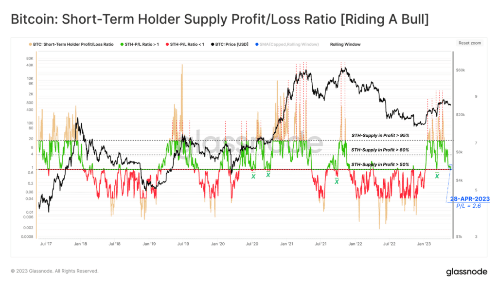 Źródło: GlassnodeCeny BTC konsekwentnie powróciły do bazy kosztowej posiadaczy krótkoterminowych (STH) i zresetowały kilka wskaźników niezrealizowanego zysku/straty. Wskaźnik niezrealizowanego zysku/straty STH znacznie się ochłodził. Wrócił do progu rentowności na poziomie 1,0 i odbił się z powrotem do 2,6. Wskazuje to na zrównoważoną pozycję zysku i straty dla nowych inwestorów. Spadek poniżej tego poziomu zwykle poprzedza dynamiczny spadek cen. Jednocześnie rynek ma tendencję do znajdowania wsparcia na tym poziomie podczas silnych rynków byka. I być może, iż właście je tam odnalazł.