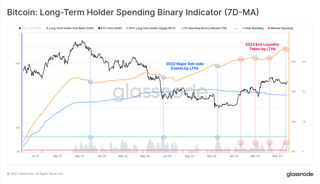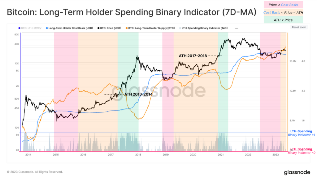 Następnie Glassnode nakłada wyniki rynkowe na intensywność wydatków długoterminowych inwestorów (zazwyczaj wynikających z realizacji zysków lub kapitulacji). Wskaźnik SBI śledzi, czy sprzdaż LTH jest wystarczająco silna by zmniejszyć całkowitą podaż posiadaną przez LTH (bieżąca średnia z 7 dni).