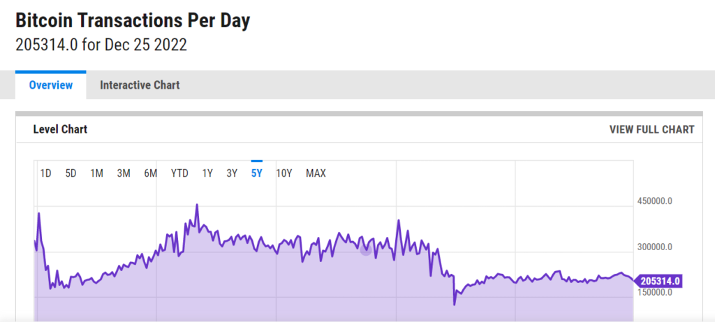 Dzienna liczba transakcji BTC spadłą z poziomów 400 000 na przełomie stycznia/lutego 2021 roku, do 200 000 obecnie. Liczba ta spada konsekwentnie od upadku giełdy FTX. Widoczna jest dodatnia korelacja między liczbą dziennych transakcji a ceną Bitcoina. Patrząc na interwał 5 letni jesteśmy w stanie ocenić, iż Bitcoin nie dokonał istotnego rozwoju w zakresie praktycznych płatności i zyskania statusa porządanej waluty rozliczeniowej, co potencjalnie wskazuje iż pozostaje narzędziem spekulacyjnym – szczególnie podatnym na konkunkturę rynkową. Źródło: ycharts- Coraz większa ilość inwestorów zaczyna rozumieć, iż kupowanie tokenów NFT było raczej przejawem szczytu spekulacyjnej manii niż zainteresowaniem nową, rewolucyjną technologią. Choć tokeny NFT, inteligentne kontrakty, a choćby DeFi rzeczywiście mają szansę zmienić świat rozliczeń finansowych i wpłynąć na znany nam świat nie musi to wiązać się z wycenami małpich i psich projektów sięgającymi dziesiątek miliardów dolarów. Czy internet w końcu lat 90-tych nie miał zmienić świata? Rzeczywiście – zmienił jednak po pęknięciu bańki trzeba było czekać kilkanaście lat by firmy jak Microsoft, Alphabet czy Apple wróciły powyżej dalekich od fundamentów wycen z lat przełomu tysiąclecia. Coraz więcej inwestorów zaczyna też rozumieć, iż popularyzacjia technologii blockchain nie musi być związana z kryptowalutami ze względu na stablecoiny, CBDC czy budowane przez banki tokeny rozliczeniowe typu JPMCoin.