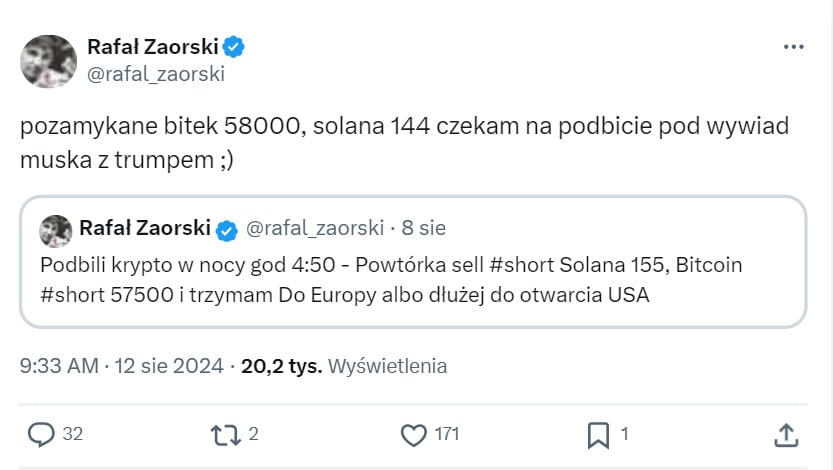 Przed takim scenariuszem ostrzegał ostatnio Rafał Zaorski, który jako 'praktyk’ i empirysta, zarobił na 'shortach’. Ale zdecydował się opuścić rynek, w oczekiwaniu na zaplanowany wywiad Elona Muska z Donaldem Trumpem. O godzinie 20:00, w platformie X odbędzie się transmisja z wywiadu lidera w wyścigu prezydenckim w USA, z jednym z najbogatszych ludzi na świecie.