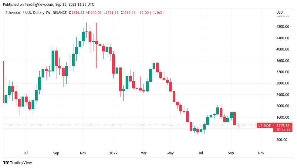 Największy altcoin według kapitalizacji rynkowej notowany był w momencie pisania po 1300 USD, najniżej od połowy lipca.