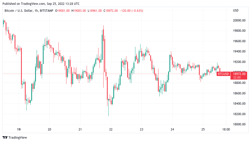 Dane z Cointelegraph Markets Pro i TradingView pokazały handel BTC/USD blisko 19 000 USD z godzinami pozostałymi do zrealizowania na tygodniowej świecy.