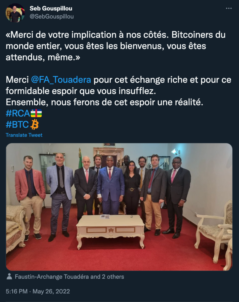 „Prawo stanowi, iż walutą cyfrową będącą prawnym środkiem płatniczym jest Bitcoin. Uznajemy to za naszą oficjalną walutę. […] Moneta Sango to projekt dla państwa Republika Środkowoafrykańska.”