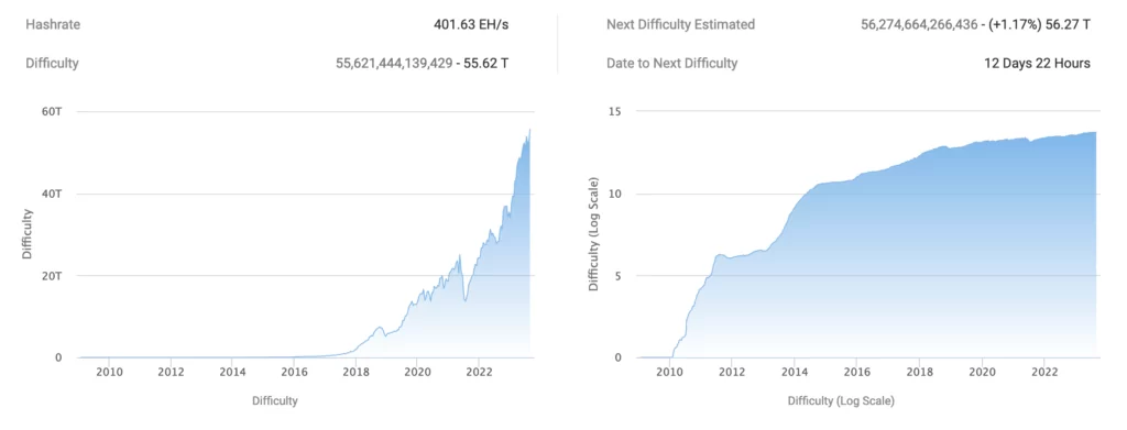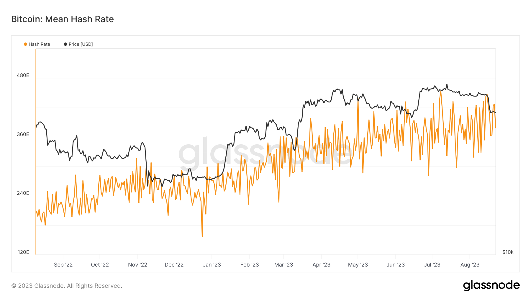 Podobna historia dotyczy mocy obliczeniowej – szacowanego wdrożenia mocy obliczeniowej przez górników na łańcuchu bloków Bitcoina. Chociaż jest ona niemożliwa do dokładnego obliczenia, moc obliczeniowa już teraz rywalizuje z obecnymi rekordami wynoszącymi ponad 400 eksahashów na sekundę (EH/s).