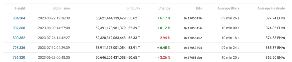 Pomimo iż cena Bitcoina spadła o 10% w zeszłym tygodniu, górnicy zdają się nie wątpić w BTC. Przy ostatniej aktualizacji sieciowej (co dwutygodniowe automatyczne dostosowywanie) 22 sierpnia, trudność wzrosła o 6,17%. Jest to rekordowy stopień trudności w historii kryptowaluty. Również oznaczało to szósty największy wzrost trudności Bitcoina w 2023 roku.