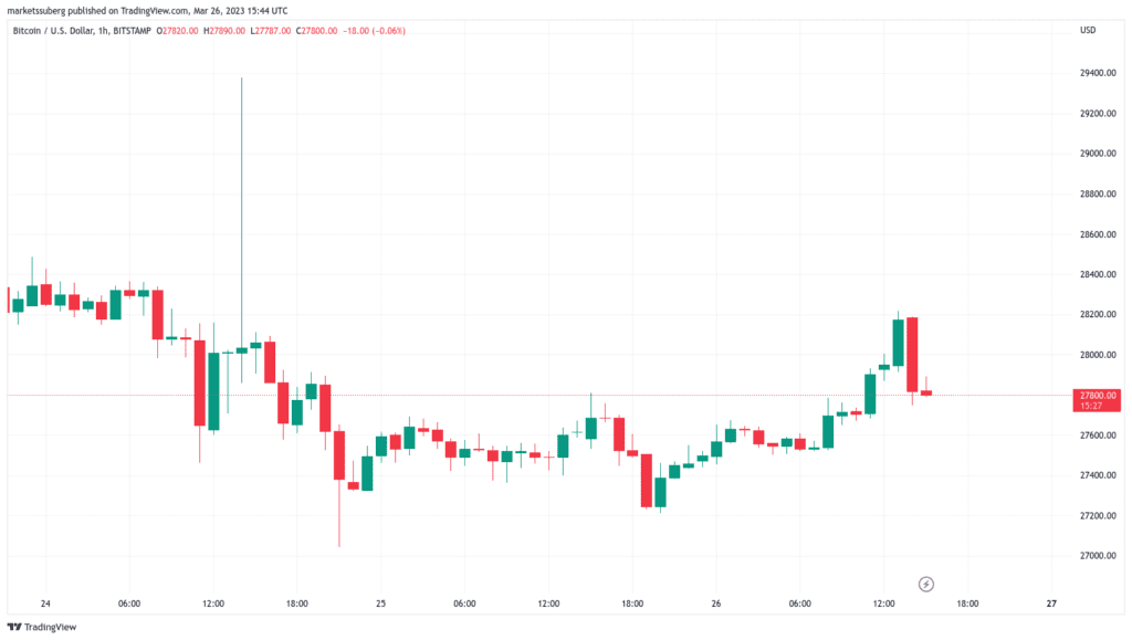 Przeważnie płaskie zachowania handlowe kilka się zmieniły, a wzrost powyżej 28 000 USD był pierwszym znaczącym wydarzeniem od kilku dni. Jednak w chwili pisania tego tekstu BTC/USD był z powrotem poniżej tego poziomu, jak pokazują dane z Cointelegraph Markets Pro i TradingView.