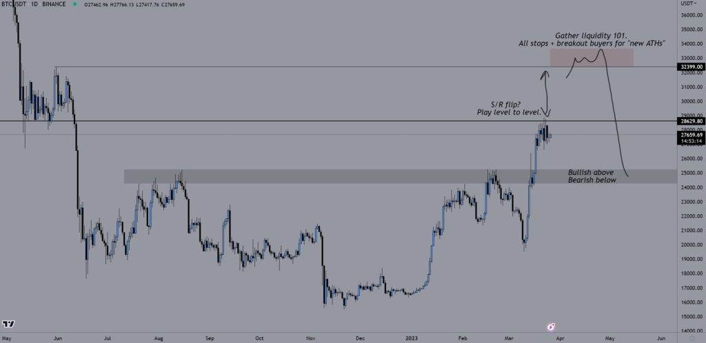 Analizując potencjalne scenariusze, trader Crypto Chase wskazał 28 600 USD jako poziom przełomu, podczas gdy 33 000 USD zostało skazane jako punkt, w którym ma nastąpić „główne odwrócenie”.