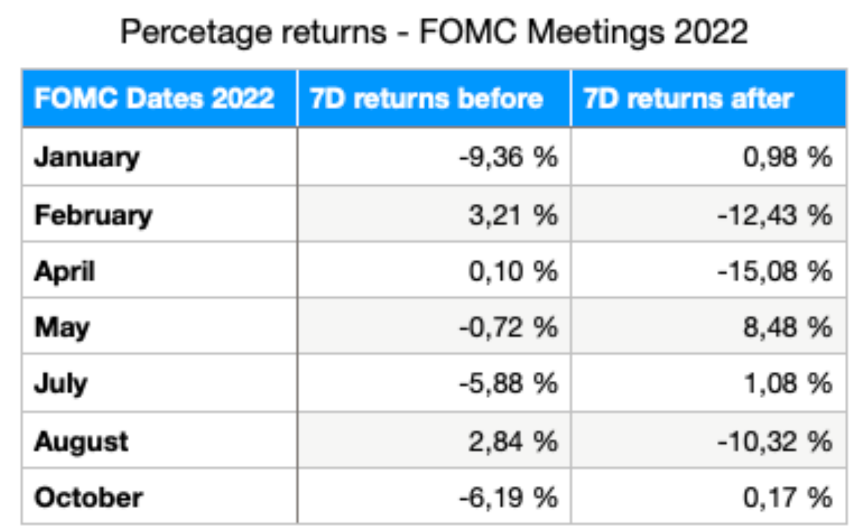 Patrząc na decyzje FOMC i reakcje Bitcoina na 7 dni przed i 7 dni po pomożemy powiedzieć, iż rozczarowanie jastrzębim Powellem zwykle miało miejsce i oznaczało spadki głównej kryptowaluty przy czym nie następowały one często od razu zatem jeszcze nie czas otwierać szampana. Wydaje się jednak pewne, iż Fed będzie musiał zwolnić podwyżki a jeżeli nałoży się na to spadająca inflacja, rynki będą mogły przyjąć 'najgorsze za nami’ jako materializaujący się scenariusz, byczy dla aktywów ryzyka. Źródło: Jarvis Labs