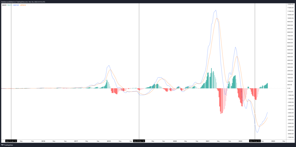 Tu widzimy dywergencje średniej ruchomej Bitcoina (tzw. MACD). Przez ostatni tydzień rynkowe byki śledziły wskaźnik obserwując jak zmienia się na kolor zielony co gistorycznie często zwiastowało zbliżanie się wybicia z cenowego dna. Dane on chain wskazują na niedowartościowanie Bitcoina choć de facto ciężko przewidzieć dokładne dno. Rajd powyżej 21 100 USD oznacza jednak wzrost powyżej średniej ceny nabycia BTC w łańcuchu bloków, co może zwiastować spadającą presję podażową i niecheć do oddawania BTC ze stratą, co dodatkowo może zamrozić podaż i wprowadzić zmienność. Źródło: TradingView