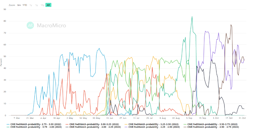Wykres wskazuje oczekiwania wobec spowolnienia podwyżek stóp procentowych, widzimy, iż te są realne. Nastroje wskazują, iż przyszłe podwyżki stóp będą niższe, a inwestorzy powszechnie uważają, iż stworzyło to możliwość szerokiego ożywienia rynku kryptowalut, korelującego w ostatnim czasie z rynkiem akcji. Źródło: Micromacro