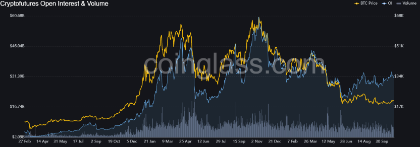 Fala likwidacji niedźwiedzich zakładów pomaga rosnąć cenie Bitcoina, likwidując na jej drodze wiszącą podaż. Dodatkowo na niedźwiedziach rośnie presja odkupienia aktywów po wyższych cenach lub zabezpieczanie pozycji 'droższym’ Bitcoinem. Tak zwany 'short interest’ rynku opcji wzrósl po tym jak Bitcoin wybił się z konsolidacji w stronę północy. Źródło: CoinglassSpadek po 20 000 USD wydawał się możliwy