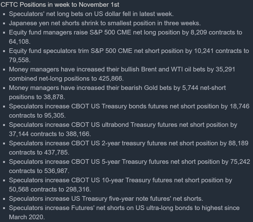 Aktualizacja pozycji raportowanych przez Commodity Futures Trading Co,mission jest łaskawa dla byków! Patrząc na bilans do 1 listopada spekulanci zmniejszyli swoje pozycje kupna na amerykańskim dolarze co często zwiastuje wzrost apetytu na ryzyko. Wzrosły też bycze zakłady na ropie co obrazuje, ze rynek naprawdę nie ocenia w tej chwili scenariusza globalnej, głębokiej recesji jako prawdopodobnego (co nie znaczy, iż się nie wydarzy ale świadczy o raczej przerysowanej panice na ten temat w obecnych mediach) i nie spodziewa się destrukcji popytu. Co interesujące po kilku tygodniach zwiększania pozycji shortujących indeks S&P500, spekulanci wyraźnie ograniczyli swoje pozycje o ponad 10 000 kontraktów (spadek o blisko 10%). Jednocześnie zarządzający aktywami zwiększyli o prawie 15% bycze pozycje na S&P500, co wydaje się dobrym zwiastunem dla Bitcoina. Złoto wciąż traci, spekulanci dołożyli około 15% pozycji krótkich. Źródło: Commodity Futures Trading Commission