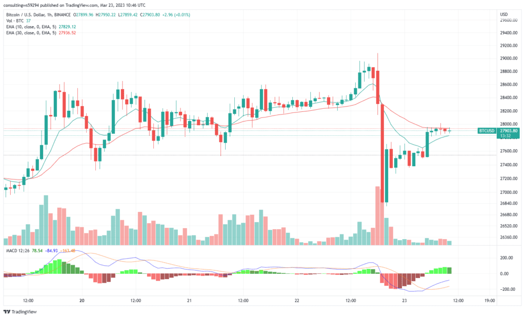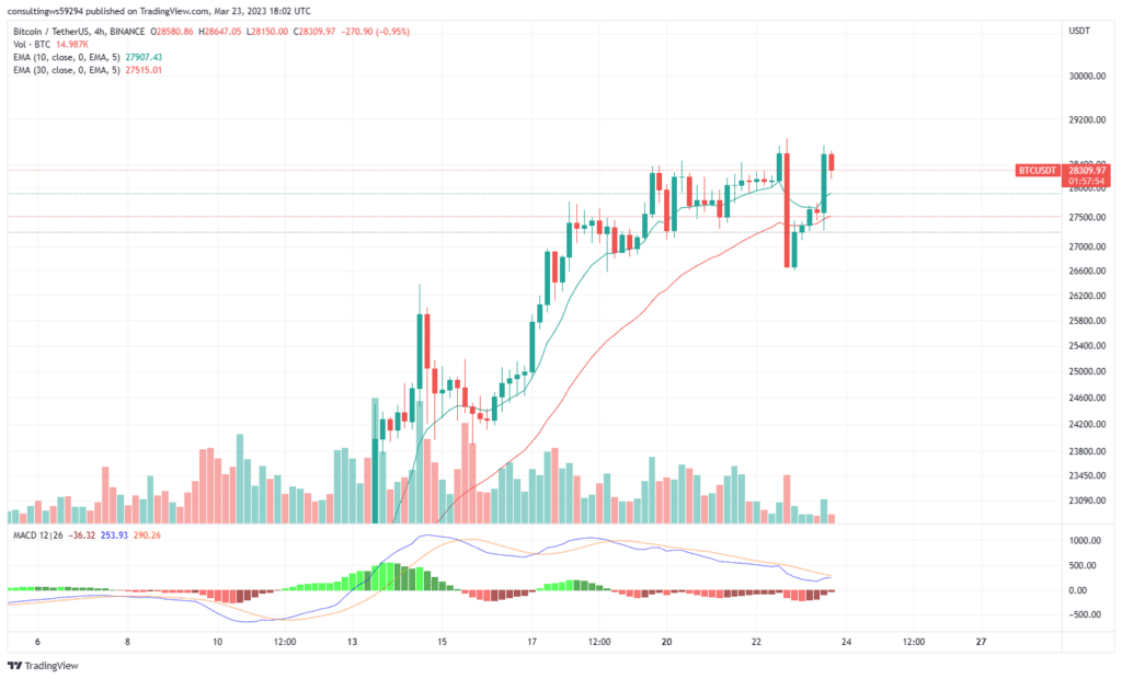 Dane dostarczone przez TradingView pokazują, iż po konsolidacji blisko 28 300 USD podczas porannej sesji, Bitcoin (BTC) wzrósł do maksimum 29 114 USD na krótko przed komunikatem Powella, a następnie gwałtownie odwrócił kurs i spadł poniżej poziomów wsparcia 28 000 USD i 27 000 USD, osiągając najniższy poziom 26 810 $.